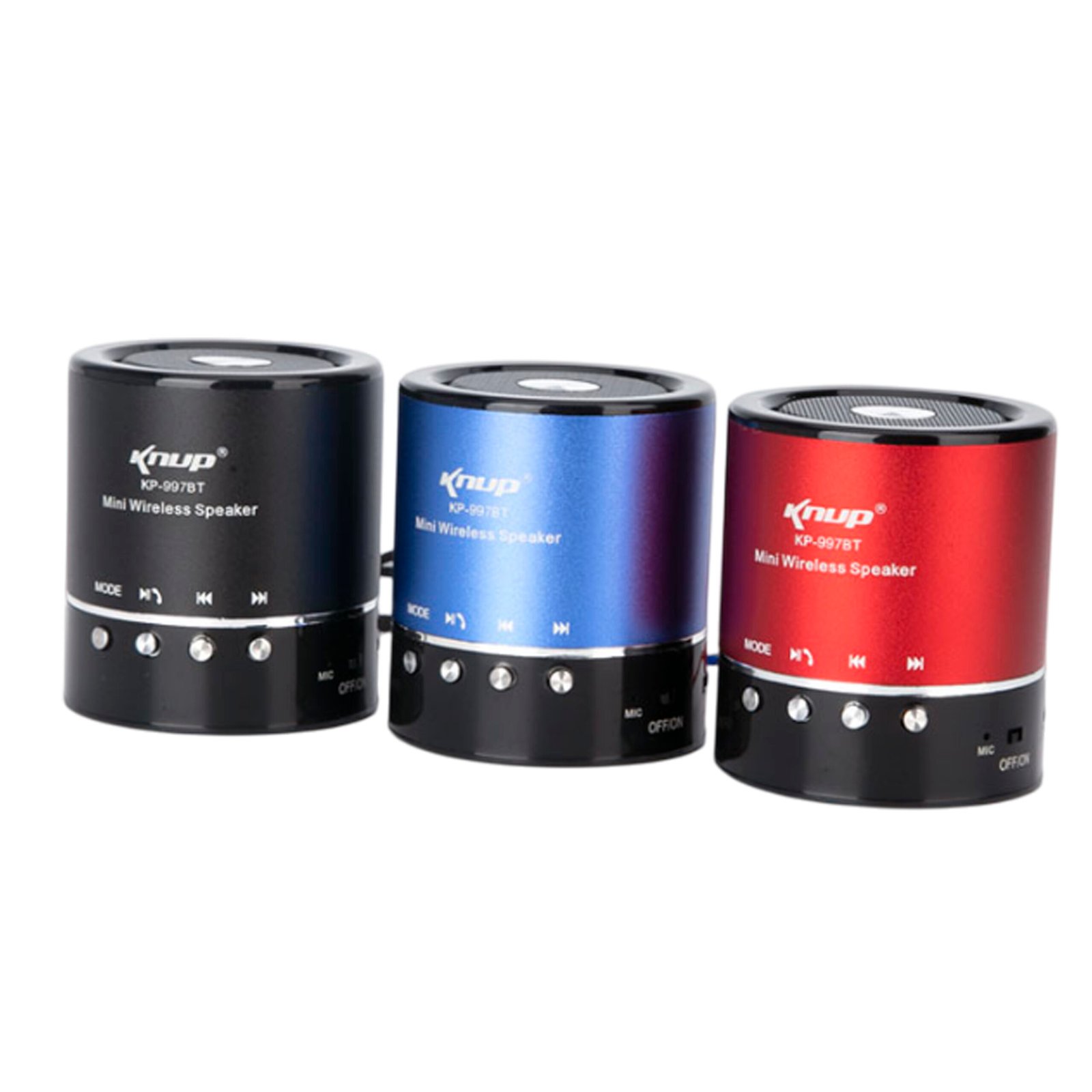 Altavoz portátil modelo KNUP KP-997BT, diseño cilíndrico compacto y ligero, con una potencia de 8 watts RMS, disponible en colores vibrantes y con múltiples opciones de reproducción.